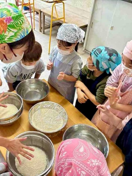 今回は幼稚園で収穫した『銀嶺米』と、市販の『無洗米』を使用するため、「冷たいお水でさっと洗うと美味しく炊ける」無洗米の特性を伝えながら手伝ってもらいました
