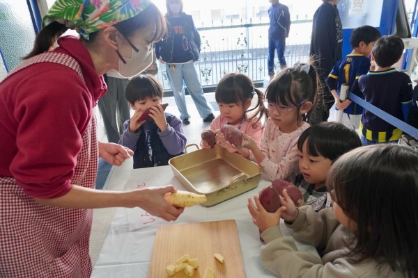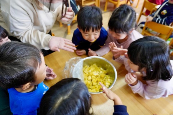 食材の確認が終わると、年長さんはいよいよさつまいもを切るお手伝いです