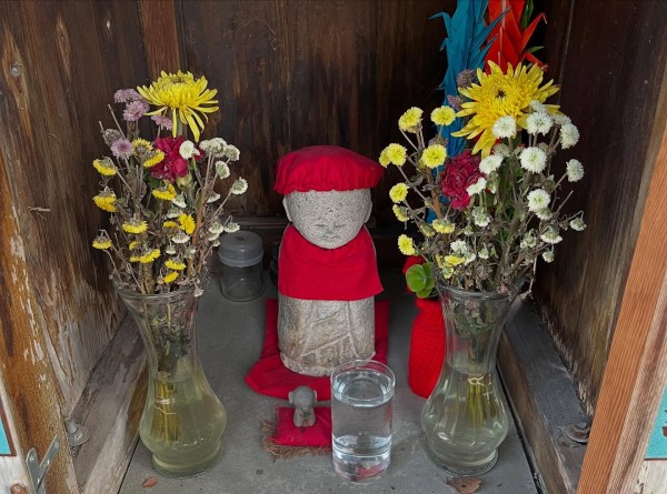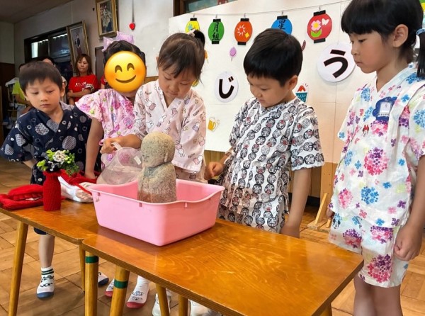 まずは、年長代表児がお地蔵様のお清めをしました。