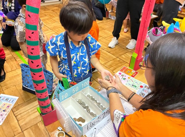 毎年、保護者の皆様がお店を出店してくださり、子どもたちは自分のお財布からお金を出して買い物をします。