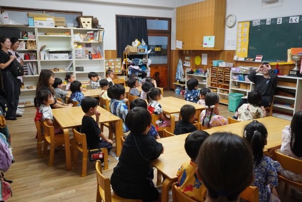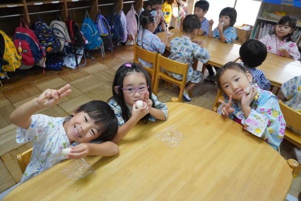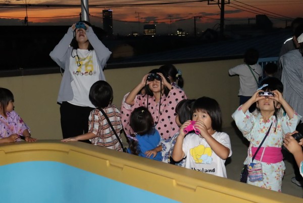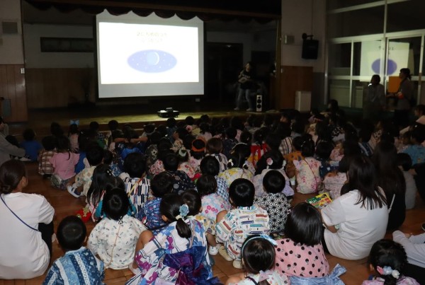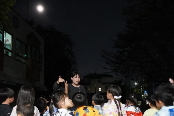 今年初めての夜間保育。登園してきた子どもたちはいつもと違う幼稚園の様子にドキドキワクワクしながら、お部屋でおだんごを食べたり、全園集会では月の満ち欠けについて学んだりと楽しみました。