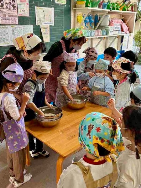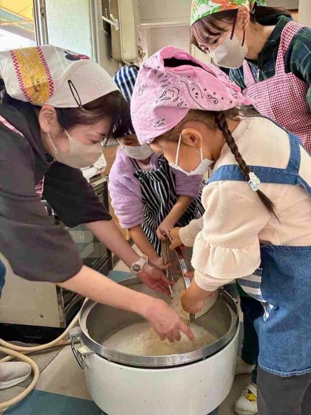 今回は幼稚園で収穫した『銀嶺米』と、市販の『無洗米』を使用するため、「冷たいお水でさっと洗うと美味しく炊ける」無洗米の特性を伝えながら手伝ってもらいました