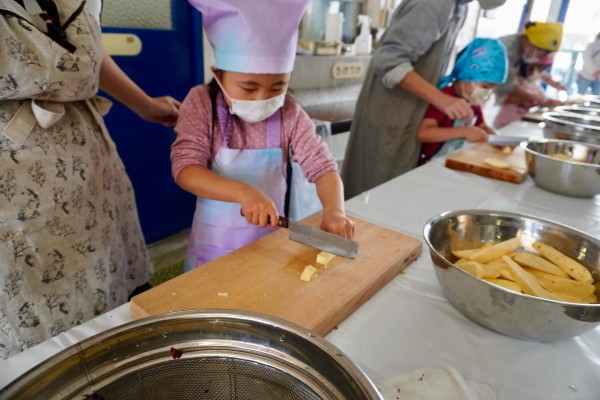 食材の確認が終わると、年長さんはいよいよさつまいもを切るお手伝いです