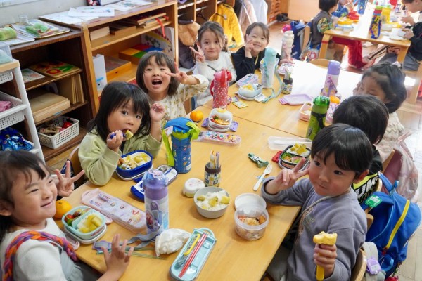 前日の準備を思い出し「お米洗う時、お水、本当に冷たかったんだよ」と、年少中さんに伝えている年長さんもいました。
